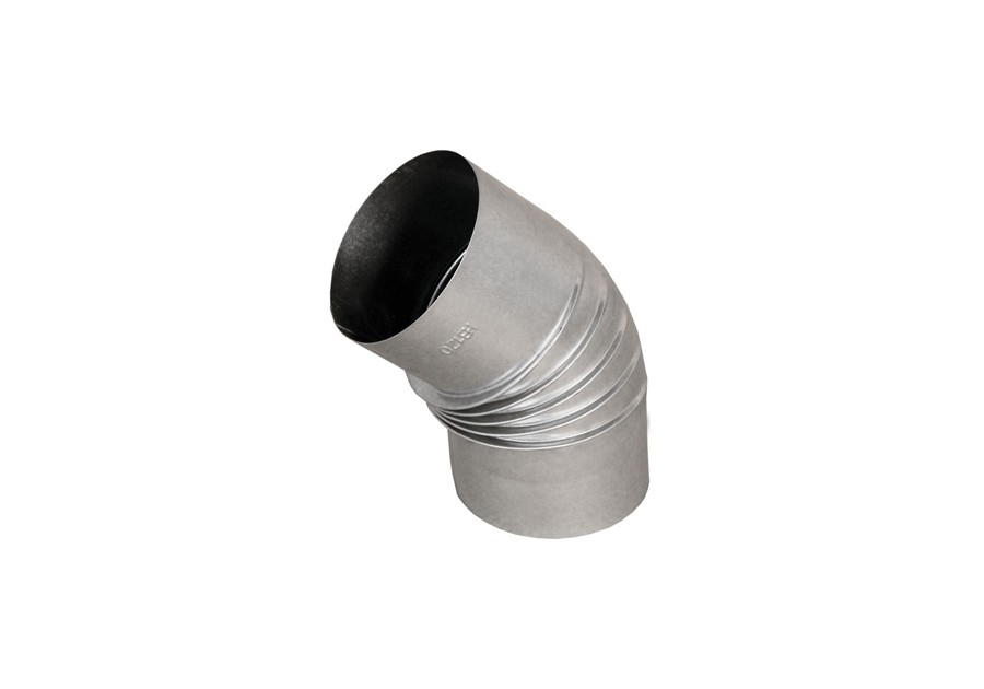 Kolanko FAL o stałym kącie zgięcia 45*, zawijane na zakładkę, przeznaczone do odprowadzania spalin z urządzeń opalanych gazem lub olejem opałowym do przewodów kominowych. Kolano wykonane z czarnej blachy stalowej aluminizowanej.