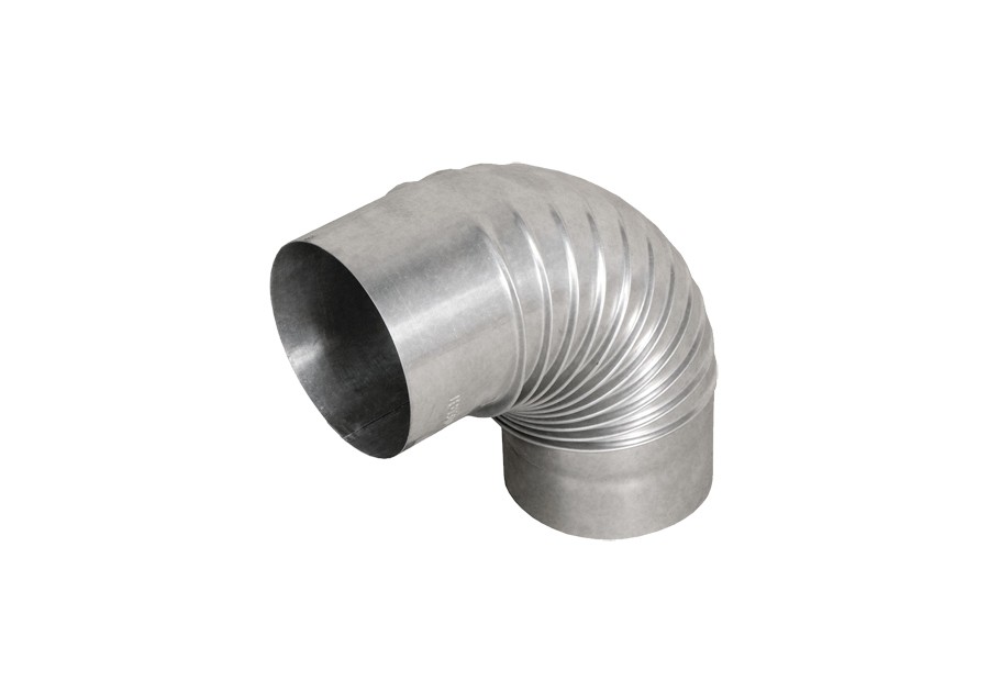 Kolano 90* FAL 100mm Kolanko FAL o stałym kącie zgięcia 45*, zawijane na zakładkę, przeznaczone do odprowadzania spalin z urządzeń opalanych gazem lub olejem opałowym do przewodów kominowych. Kolano wykonane z czarnej blachy stalowej aluminizowanej. - ...