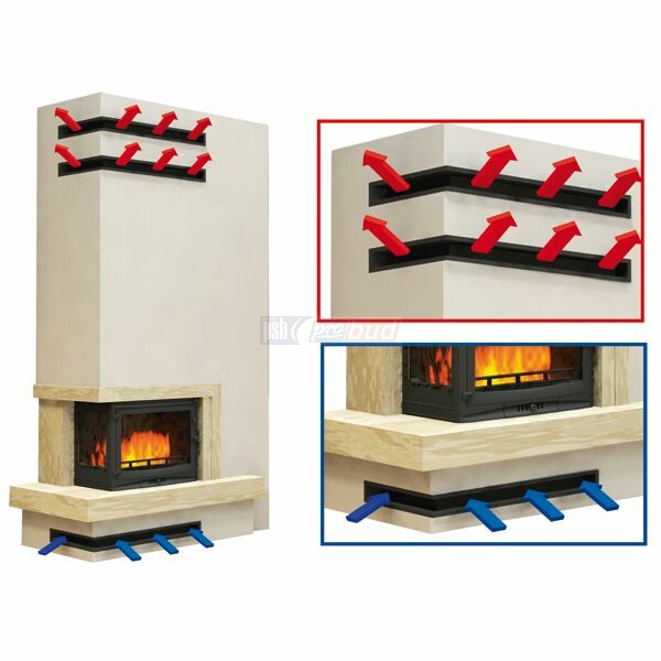 Natomiast gdy kratka otwarta ma być zastosowana do nawiewu chłodnego powietrza do obudowy kominkowej, powinna być instalowana w dolnej części obudowy w taki sposób, aby wewnętrzny otwór wlotu powietrza skierowany był ku górze. Należy zapewnić odpowiedni przepływ powietrza odbierającego ciepło od korpusu wkładu. Wlot zimnego powietrza na dole zabudowy powinien mieć powierzchnię minimum 10 dm2. Powietrze musi opływać swobodnie wkład.