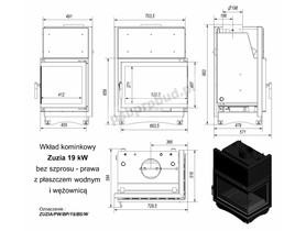 Wkład kominkowy Zuzia 19 kW z płaszczem wodnym, prawa/lewa boczna szyba (łączona bez szprosa) z wężownicą + dolot